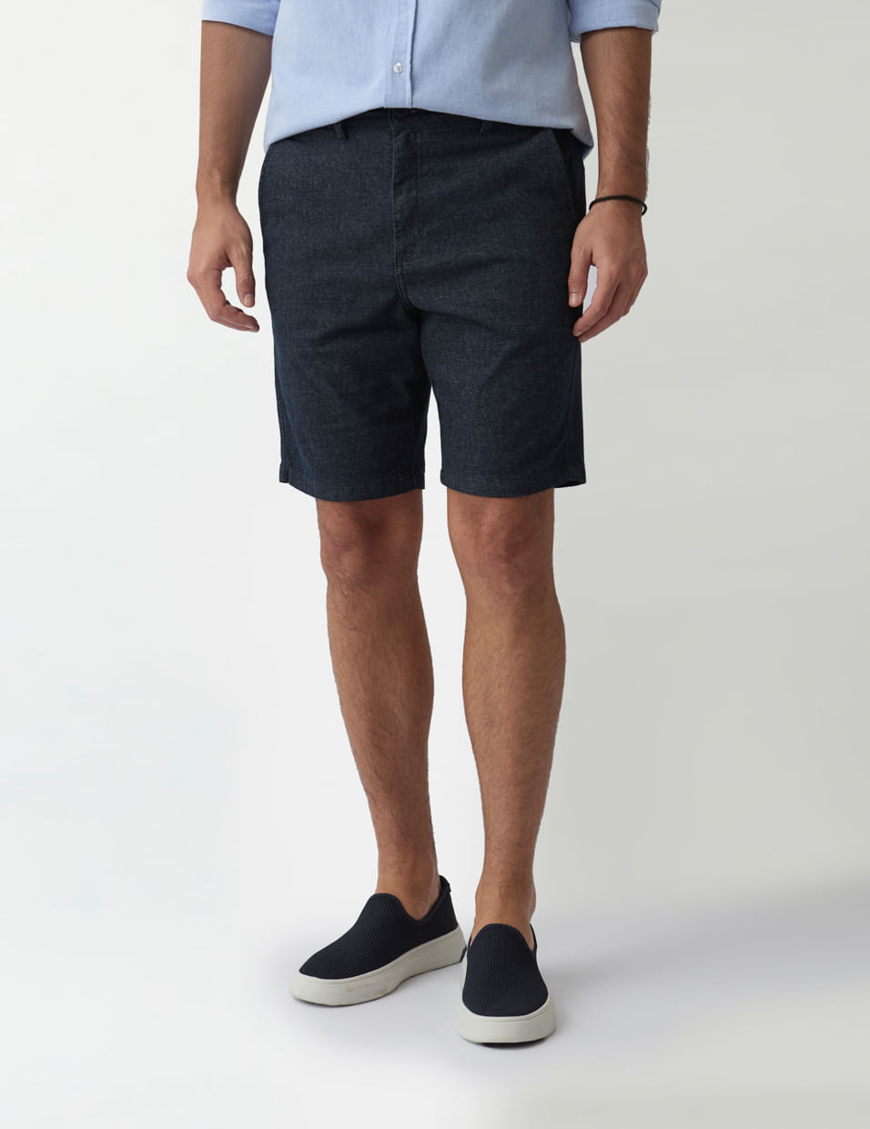 A bermuda chino Flex azul-marinho é confeccionada com a combinação de algodão e um pouco de elastano, aspectos que oferecem não apenas durabilidade, mas um toque suave e flexível para essa peça-chave.